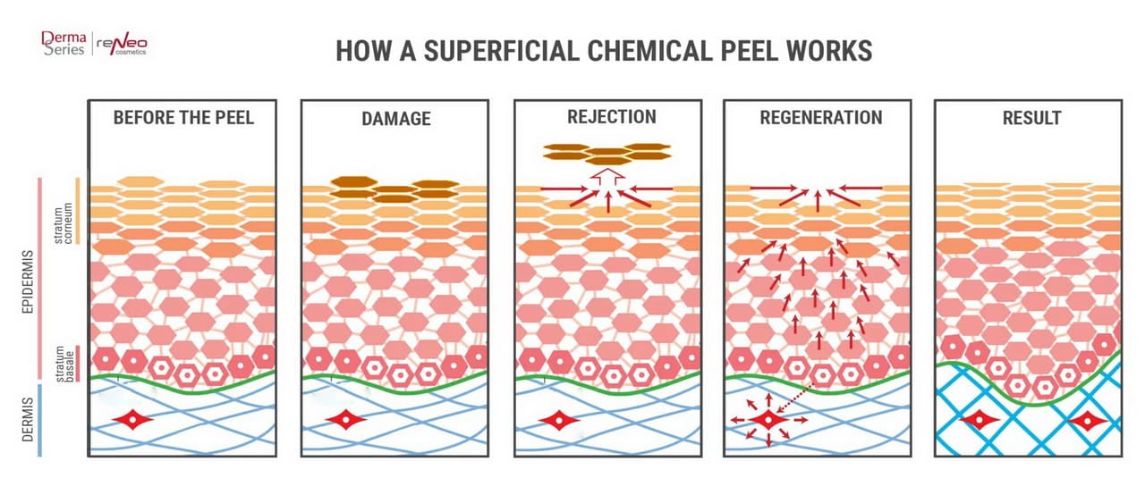 The main task of a peel is controlled damage to the upper layers of the skin to stimulate its renewal. Superficial chemical peels work within the epidermis. Acid on the surface of the skin causes non-specific inflammation, which leads to the synthesis of chaperone proteins. The division of basal layer cells is stimulated, the regeneration process and the metabolic activity of cells are enhanced.