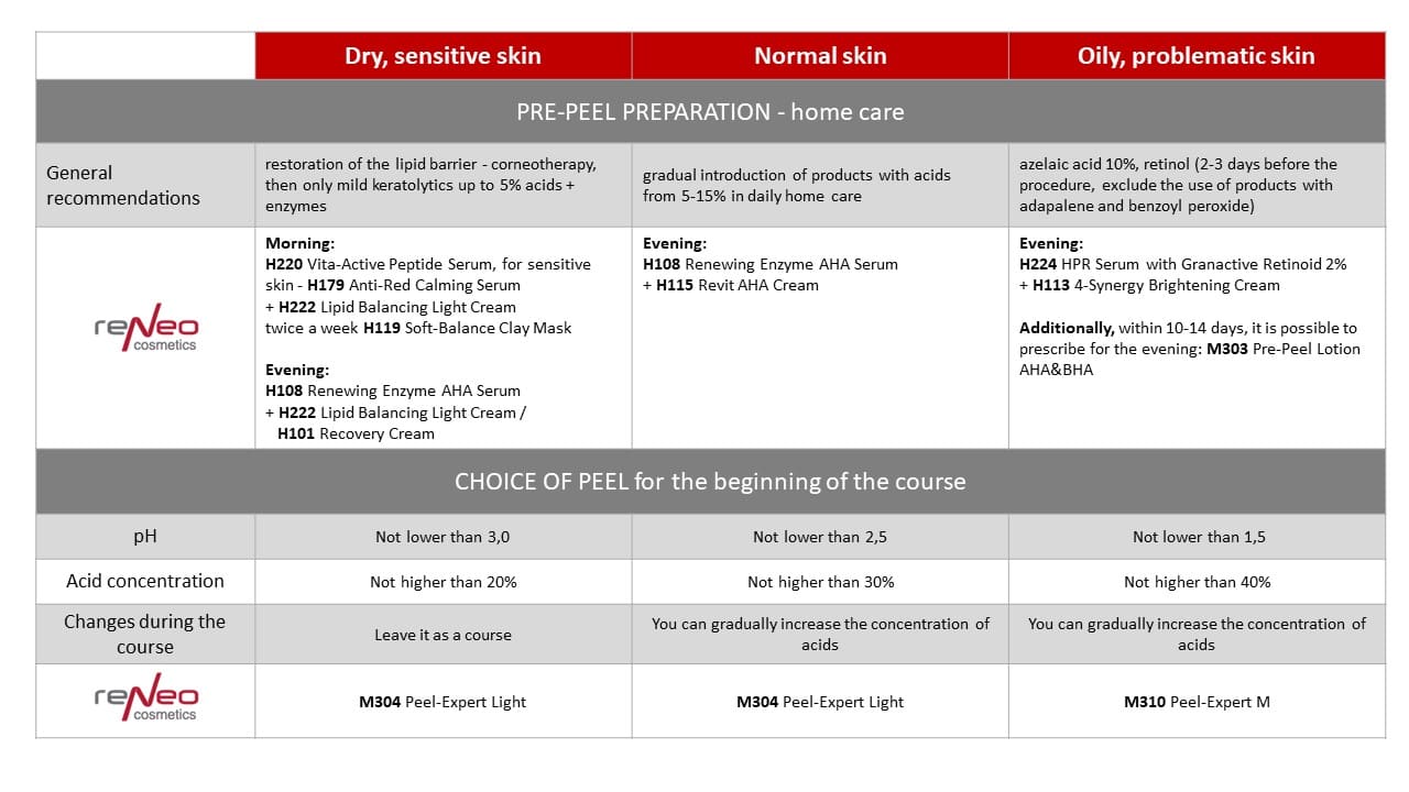 - oily problematic skin – azelaic acid 10%, retinol (2-3 days before the procedure, exclude the use of products with adapalene and benzoyl peroxide); starting peels with pH not lower than 1.5, concentration of acids not higher than 40%, you can gradually increase the concentration of acids.