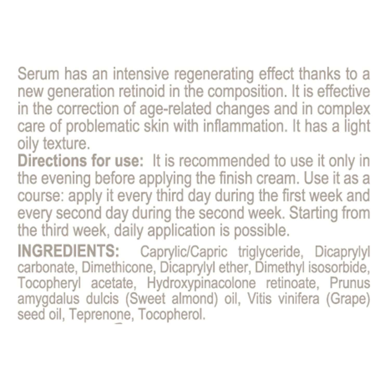 HPR SERUM with peptides and retinoid of the latest generation specifically affects the nuclear receptors of skin cells, stimulates renewal, regeneration, and synthesis of new structures of the extracellular matrix. Serum helps to even out the microrelief and skin tone, narrows pores, normalizes keratinization processes, and reduce rashes. Als restores skin elasticity and hydration, significantly improves its color, and smoothes fine wrinkles. It contains two unique components. The latest generation HPR retinoid is the most effective for skin renewal among retinol derivatives and at the same time it is absolutely safe, with a very low irritation potential. Renovage peptide complex promotes skin thickening and restoration of its turgor by stabilizing telomeres in the DNA cells. The complex of sweet almond and grape seed oils saturates the skin with antioxidants, preventing inflammatory and oxidative processes in tissues. The serum has a light oily texture and is perfectly absorbed without creating a film on the skin surface.