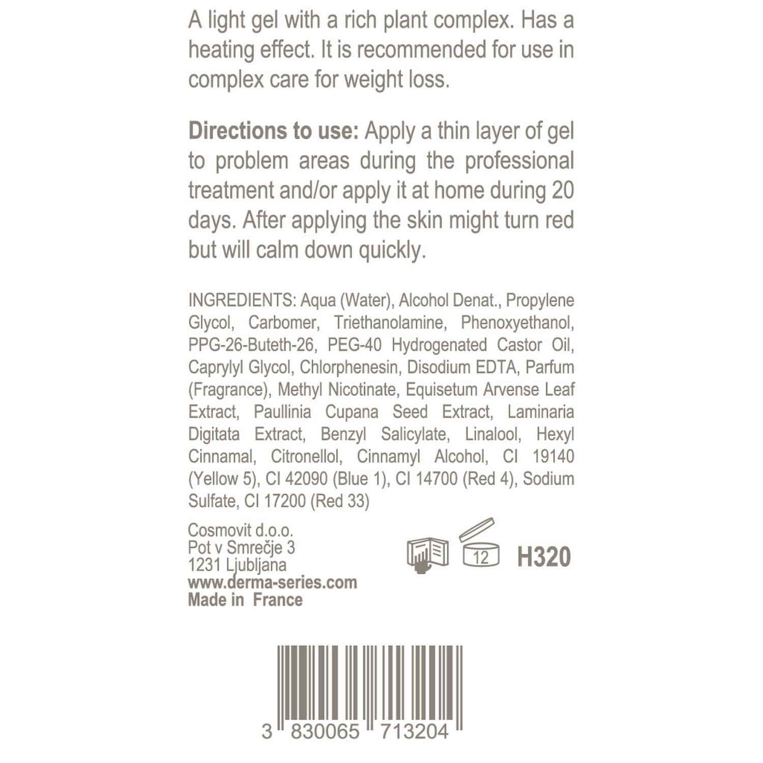 Thermoactive gel has a very light texture, reduces cellulite and is quickly absorbed without leaving stickiness. Highly active components: extracts of guarana and kelp and field horsetail guarantee this effect. This gel for figure correction provides a local increase of tissue temperature, which directly affects the metabolism of the cells. Also it stimulates the microcirculatory channel, providing a powerful lipolytic and lymphatic drainage effect on problem areas. It is an excellent product to lose weight, reduce the volume and get rid of the effect of “orange peel”.