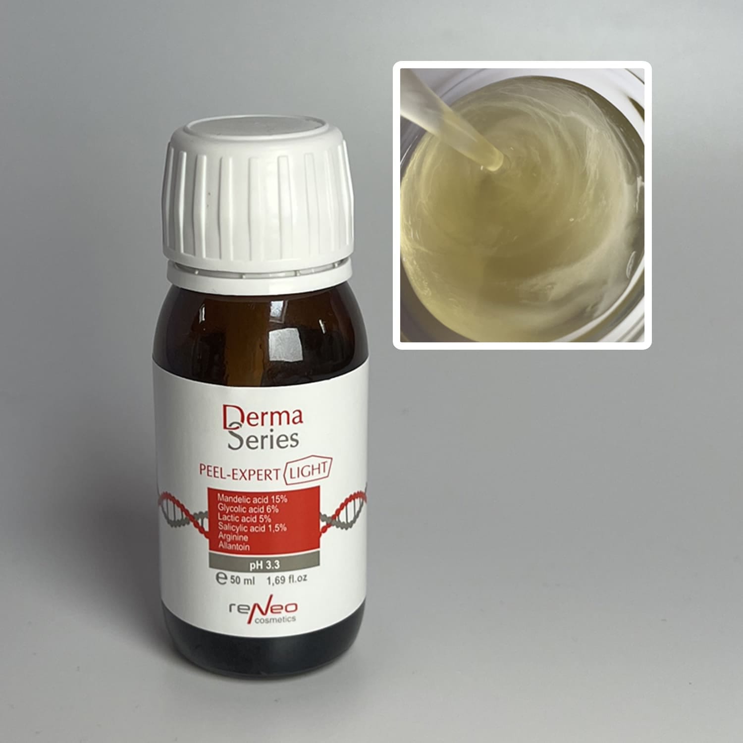 MANDELIC ACID has the largest molecular weight, that gently smoothing the microrelief of the stratum corneum without falling through into the underlying skin layers. By breaking up the protein bonds between the keratinocytes it creates conditions for more even penetration of the other peeling components.