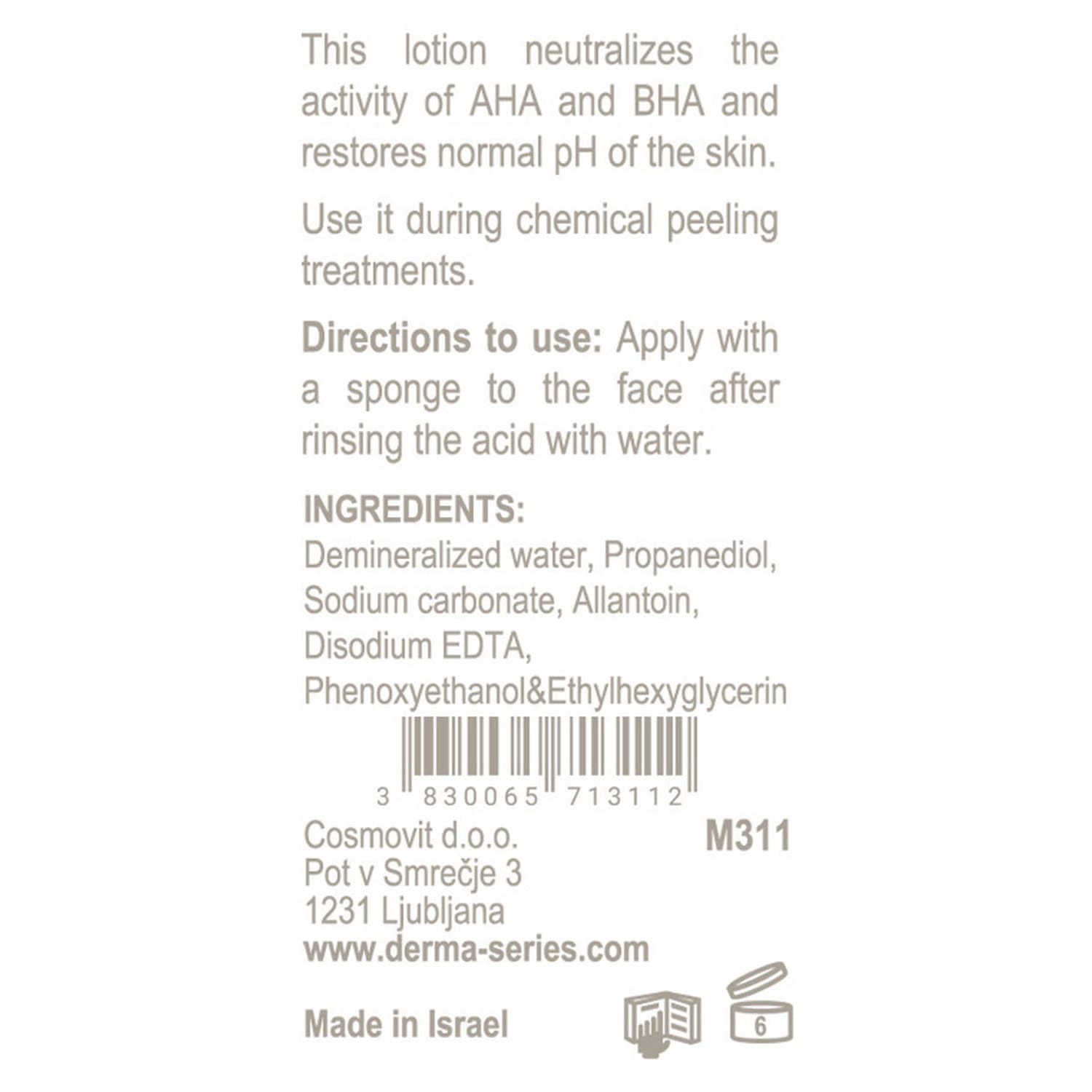 This lotion neutralizes activity of AHA and BHA. It restores normal skin pH after aggressive influence of chemical peel. Allantoin provides quick skin restoration and regeneration after damaging action of acids.