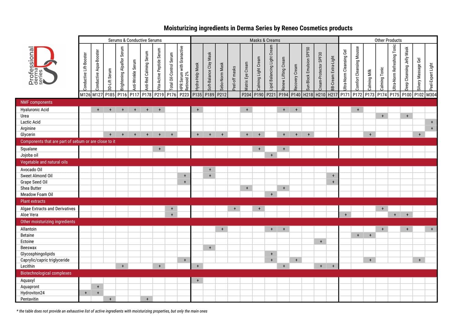 One of the most important aspects of ensuring tissue hydration is the replenishment of the components of the natural moisturizing factor (NMF) of the skin. Therefore, the most common moisturizing components in professional cosmetics are NMF components: amino acids, lactic acid, urea, polysaccharides (hyaluronic acid, glycerin).