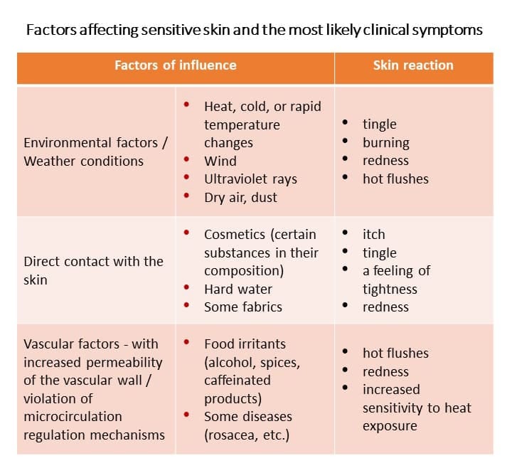 Clinical signs arise under the influence of trigger factors – exogenous and endogenous. Many factors influence the formation of sensitive skin syndrome: age, gender, stress, genetic and constitutional factors, environmental factors, food irritants, dermatological diseases.